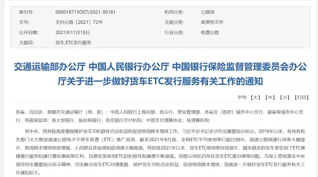 11月15日,交通運(yùn)輸部辦公廳、中國人民銀行辦公廳、中國銀行保險(xiǎn)監(jiān)督管理委員會辦公廳聯(lián)合發(fā)布《關(guān)于進(jìn)一步做好貨車ETC發(fā)行服務(wù)有關(guān)工作的通知》: